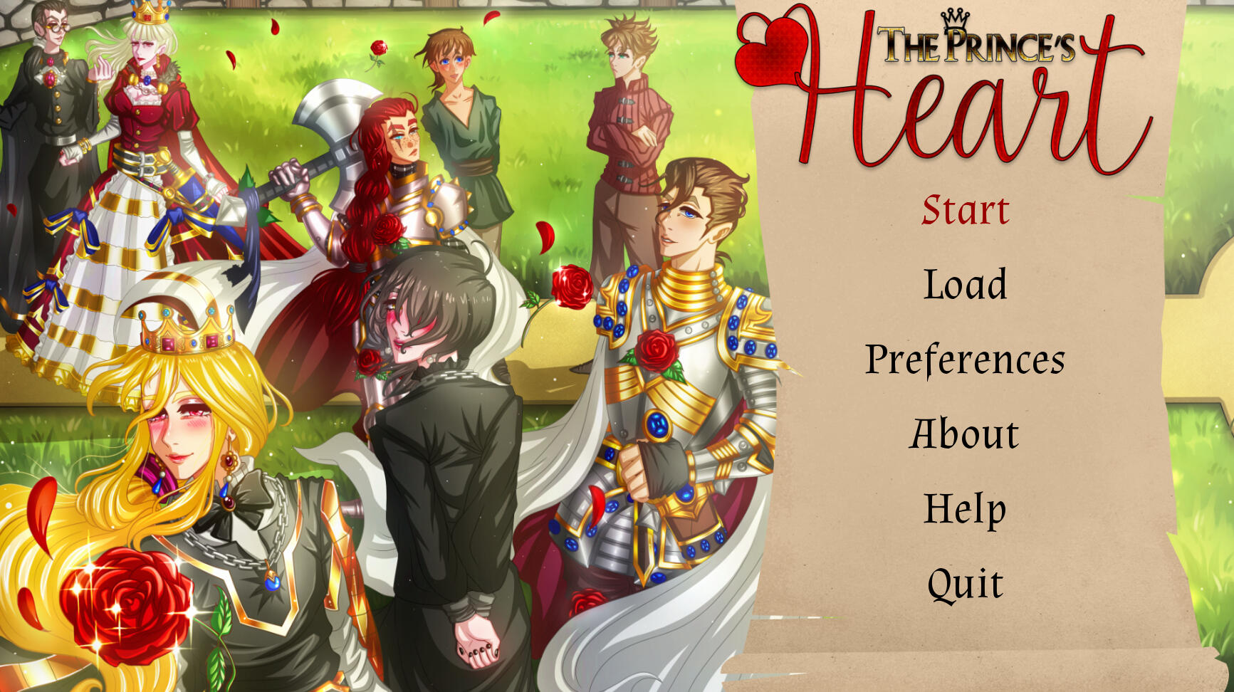 Link: Itch.io pagePaper scroll look was the main look while using the shape and pen tool for the shape I wanted. Added color, texture, shadows, and finally wear and tears.The font types used were to fit the time period.The logo took colors from the Prince's palette and had a heart and a crown. The crown is black instead of yellow for symbolism while the heart shape is the same color as the word "Heart" is hugging it with the loops premade in the font choice.