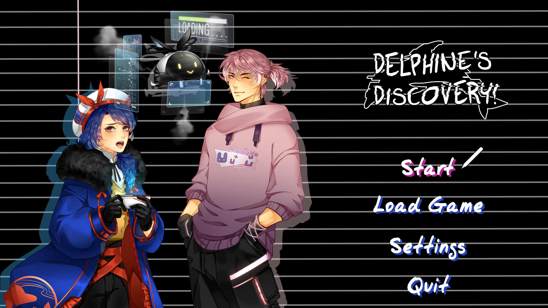 Link: Itch.io pageI always wanted to design a dark notebook. Used one of my real notebooks as a guide. Colors were added to show that something changed when hovered or clicked.Since the main character, Delphine, takes notes this really ties in well by setting the story from the start.Using handwriting text from Fontsquirrel and choosing colors from Delphine and Dei, a romantic love interest, it was a minimal design that still gives an unsettling feeling.The logo is immediate unsettling, with the glitched dolphin vector and matching font for the game's title. This shows that everything is not what they seem.